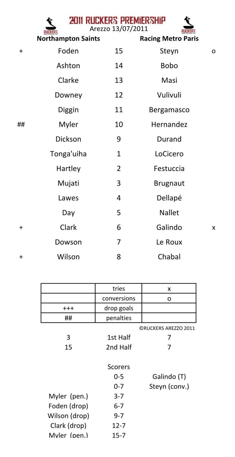 Il Racing getta il cuore oltre l'ostacolo - anche se l'ostacolo si chiama Northampton Saints - e chiude il primo tempo in vantaggio, sul 7-3, facendo vedere un buon gioco e mettendo in difficoltà i "rilassati" Saints. Nel secondo tempo, dopo un parapiglia in area di meta che si risolve in una mischia sui cinque metri, i parigini si arrendono al piede dei neroverdi. Partita che si chiude sul 15 a sette e Racing che vede sfumare il punto di bonus e, grazie alla mancata vittoria, anche la possibilità di relegare all'ultimo posto in regular season i Buccaneers. Come dire, si va a Roma... ma non si vede il Papa!