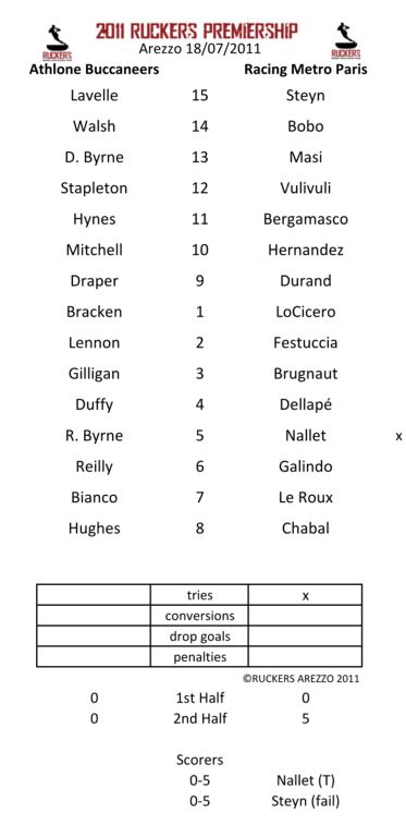 Parigi si alza in piedi. Sfilano i Bucanieri.Racing in partita fino all'espulsione temporanea di Bergamasco. Dal giallo in poi fanno tutto i Buccaneers. Anche scoprendosi troppo in attacco, lasciando la difesa sguarnita.