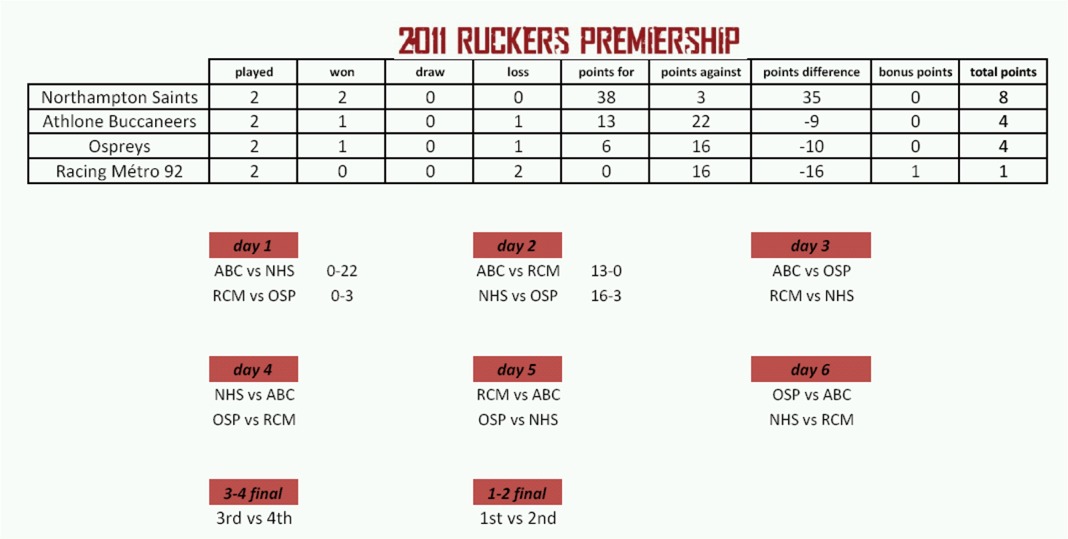 Ruckers Premiership 2011 - Ranking & Fixture after Day 2